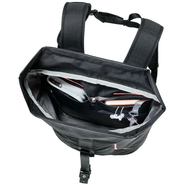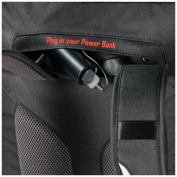 When you’re out on your bike after dark, stay safe and visible with the ALLSPARK pack. With LED illumination by OSRAM, this sporty courier pack really stands out in the dark. To activate the LEDs, simply connect a power bank to the USB plug inside the pack, and the back of the pack will be fully illuminated. The interior of the pack is also illuminated, which is very handy when you’re packing or unpacking your kit. The main compartment has enough room for essentials and has a roll-top closure system that allows you to vary the volume. And there are several handy stash pockets for smaller items of kit. There is a practical little security pocket at the back of the pack that provides a safe and easily accessible place to stow your wallet. The ALLSPARK is also equipped with additional useful features, including a magnetic buckle, a sternum strap and gear loops on the front.