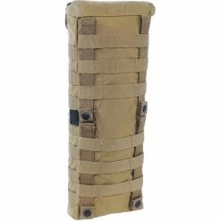 Volume-adjustable bag for hydration systems with MOLLE reverse system. The folded pouch is designed for a 1 to 1.5-liter hydration bladder. A zipper on the bottom can be used to adjust the volume for up to 3-liter bladders or to make space for other gear. The bag is specially designed to be attached to plate carriers.
